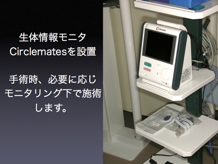 高齢の方、合併症をお持ちの方、全身状態に注意を要する方は、医科主治医との連絡をとり安全に処置を行いますが、術中も必要に応じモニタリングを行います。